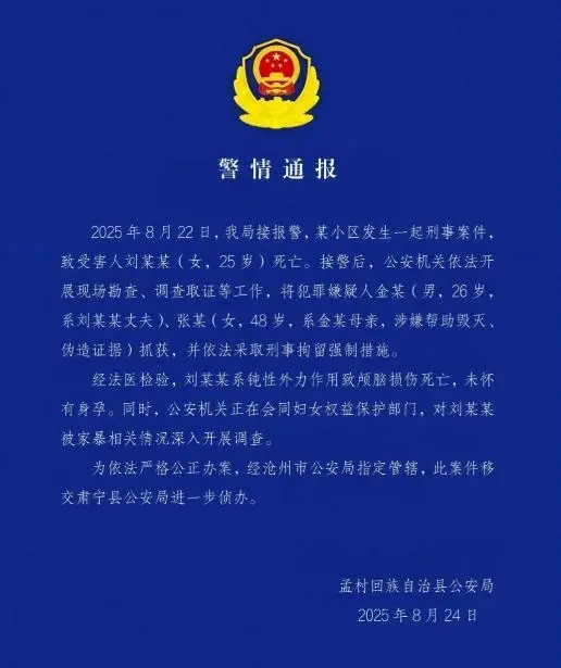 据河北沧州孟村县公安局警情通报,2025年8月22日,该局接报警,某小区发生一起刑事案件,致受害人刘某某(女,25岁)死亡。接警后,公安机关依法开展现场勘查、调查取证等工作,将犯罪嫌疑人金某(男,26岁系刘某某丈夫)、张某(女,48岁,系金某母亲,涉嫌帮助毁灭伪造证据)抓获,并依法采取刑事拘留强制措施。经法医检验,刘某某系钝性外力作用致颅脑损伤死亡,未怀有身孕。同时,公安机关正在会同妇女权益保护部门,对刘某某被家暴相关情况深入开展调查。