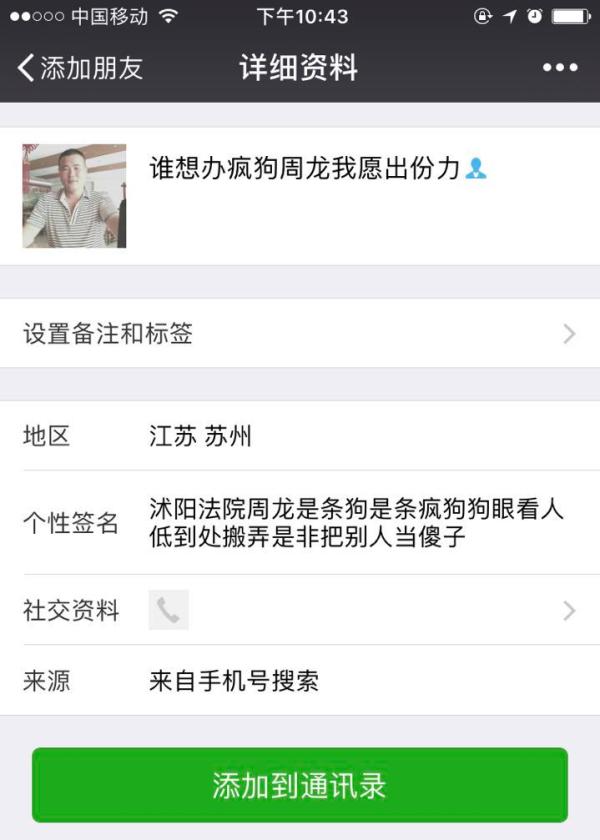 根据帖子中所公布胡小干本人手机号码,搜索出的微信号,无论名字还是个性签名,均充斥着对周龙等沭阳法院相关人员的辱骂。