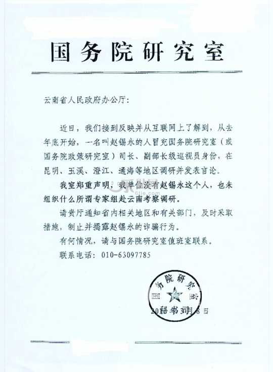 国务院研究室发函揭露“司长”赵锡永是骗子 资料图